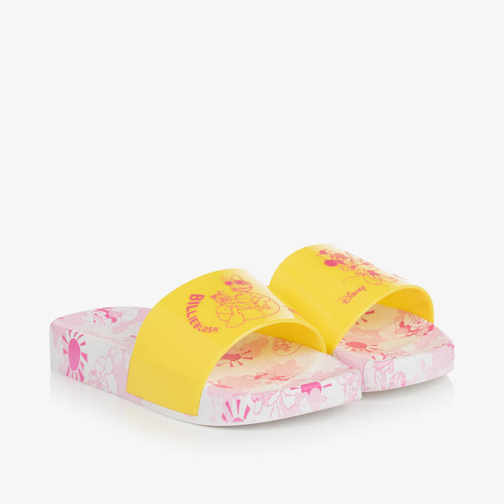 Fun sliders for girls by Billieblush, with glossy yellow straps. Part of the Disney collection, these slip-on shoes have pink Disney characters on the foot strap with curved logo branding. The shaped footbed is designed in shades of pink and white and patterned with Minnie Mouse, Daisy Duck and other beach-themed graphics. The rubberised outsole is patterned with raised stars for a good grip.