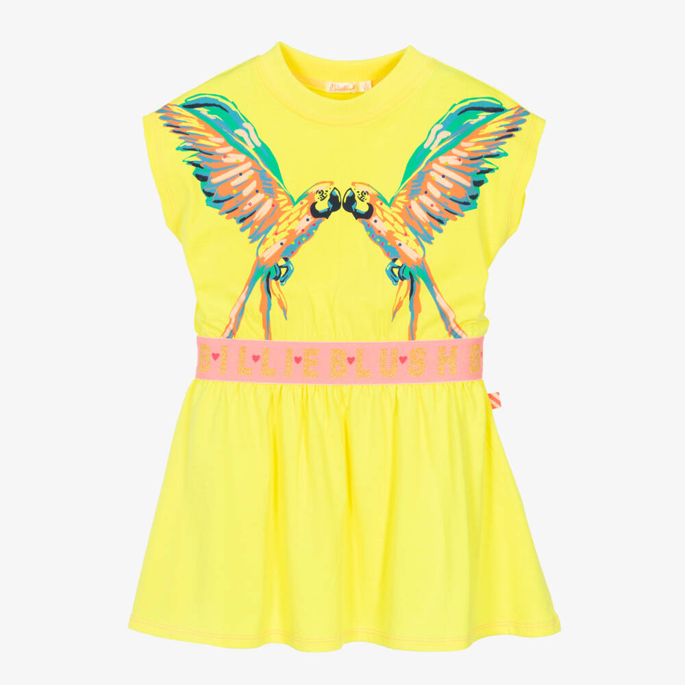 Make a bold statement in this neon yellow T-shirt dress for girls by Billieblush, made in the softest cotton jersey. Cool and casual, it has a colourful parrot design slogan printed on the front, with a neon pink elasticated waistband and the brand's iconic tag logo on the side.