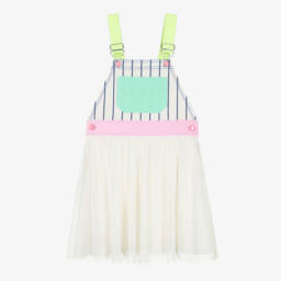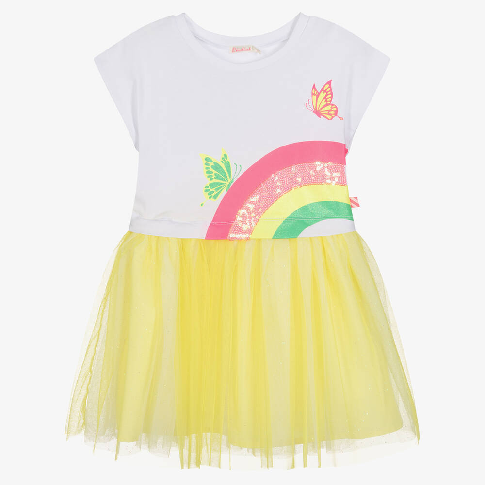Exclusive to Childrensalon, this playful white and yellow dress for girls is from Billieblush. Designed to look like a two-piece, the cotton jersey bodice is printed with glittery butterflies and a sequined rainbow. It has a voluminous tulle skirt attached, with pretty specks of glitter for casual glamour.
