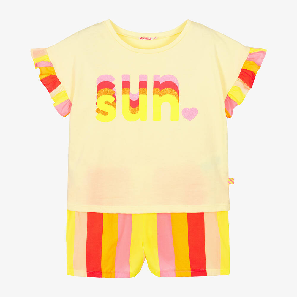 A fun and vibrant look for girls, this yellow T-shirt and striped shorts set is from Billieblush. The soft cotton jersey T-shirt has ruffle trims and a 'sun' print in neon shades of pink, orange and yellow with a glitter sparkle. The coordinating shorts are made in lightweight crêpe with a comfortable cotton lining and an elasticated waistband for ease.