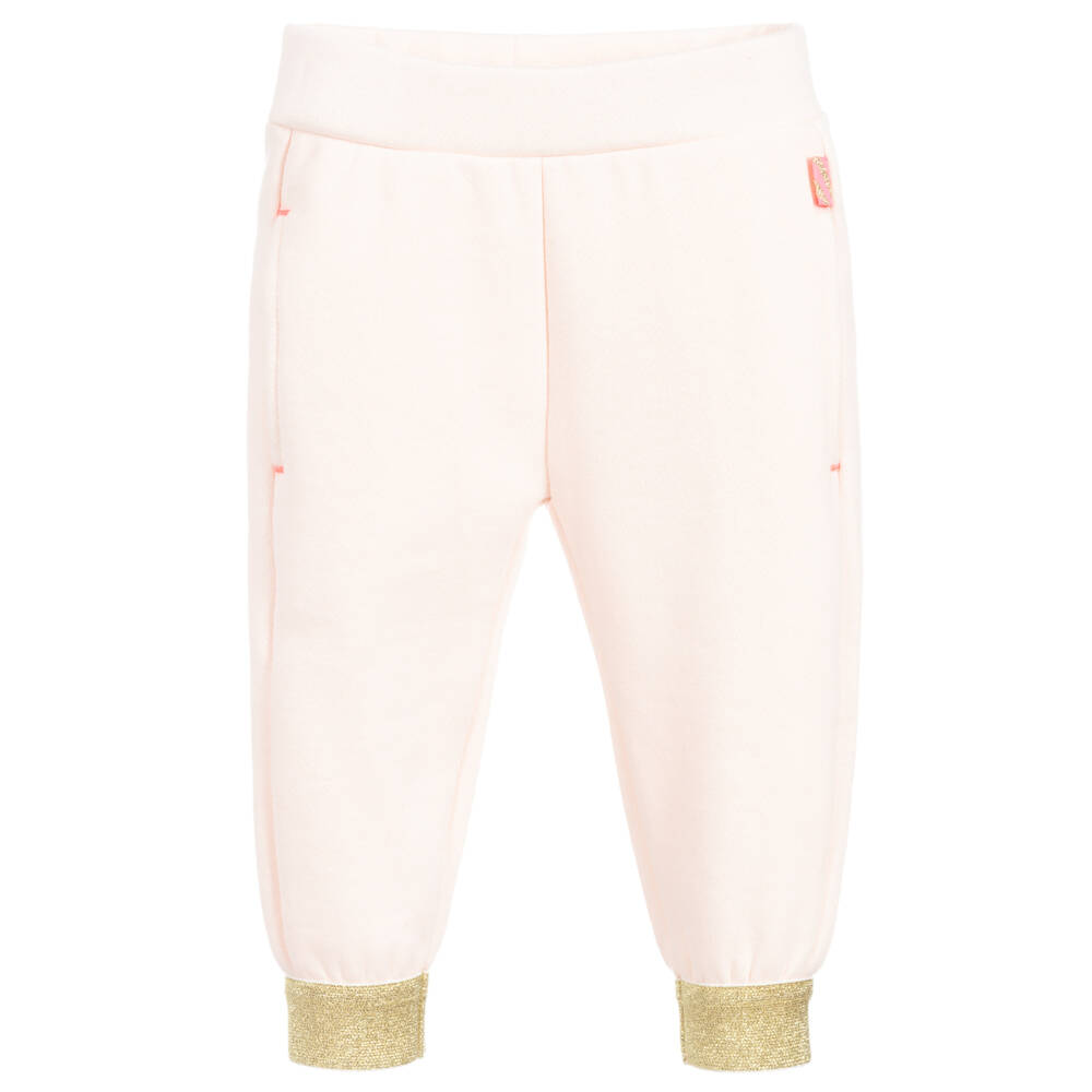 Pale pink joggers for little girls by Billieblush, made in soft cotton jersey. They have elasticated gold ankle cuffs and gold trim on the back pocket.