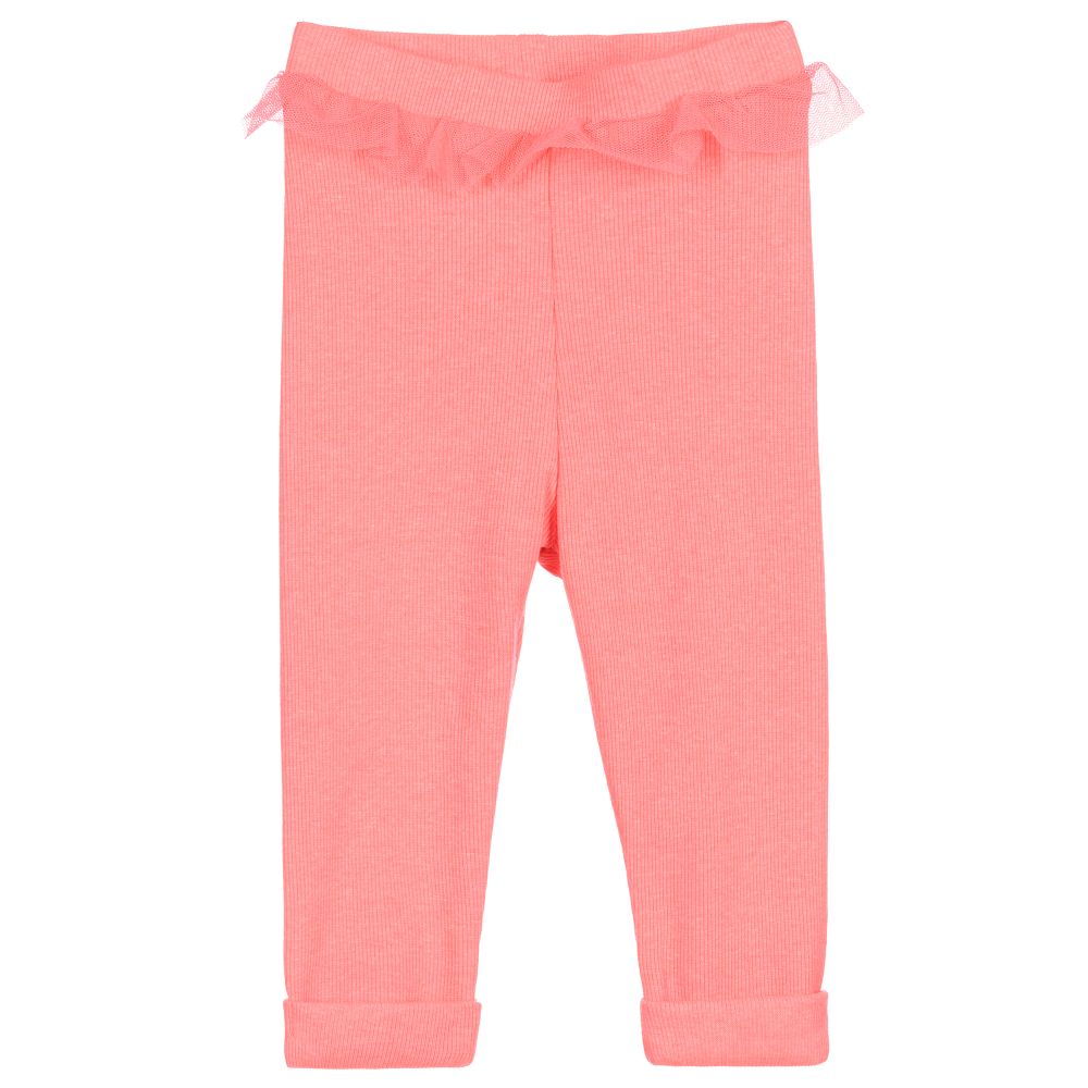Neon pink leggings for little girls by Billieblush, made in soft and stretchy ribbed jersey. They have a tulle frill around the waist and turn ups at the ankles.