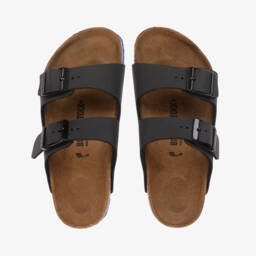Black Arizona sandals for boys and girls by Birkenstock, made with the brand's signature, soft Birko-Flor faux leather. This dual-strap style, with adjustable buckles, provides a custom fit, while the synthetic material ensures durability and easy maintenance. Featuring a cork and leather footbed that moulds to the foot, these sandals offer comfort and support for active days. Updating the classic design, they have a contrasting, bright blue outer sole, made in soft, non-slip rubber with ridges for improved grip.