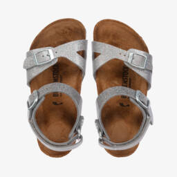 Lustrous ivory Rio sandals for girls by Birkenstock, made with the brand's signature, soft Birko-Flor faux leather for durable wear. Sporty and elegant, they have buckle fastening straps with a velcro strap around the heel for a secure fit. The anatomically shaped cork-latex and suede leather footbed ensures comfort, while the textured, non-slip rubber outsole provides reliable grip, ideal for daily adventures.