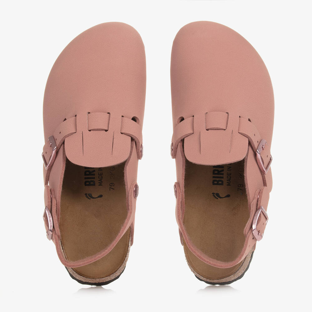 In dusky pink, these faux leather clog sandals for girls are by German designer Birkenstock. The narrow fit design has two buckle-adjustable straps for a comfortable fit, one which can be folded back to provide additional support as a backstrap. The anatomically shaped leather footbed provides support, and the ultra-lightweight treaded soles ensure a steady grip. Natural cork midsoles give that classic Birkenstock look and branded metal hardware adds a finishing designer touch.
