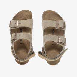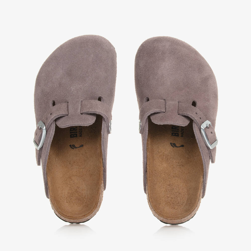 In faded purple, these suede leather Boston clog sandals for girls are by German designer Birkenstock. The narrow fit design has a single buckle-adjustable strap across the foot for a comfortable fit, with an anatomically shaped suede footbed providing support. There is a natural cork midsole for that classic Birkenstock look, with ultra-lightweight treaded soles for a sure footing. Branded metal hardware adds a finishing designer touch.