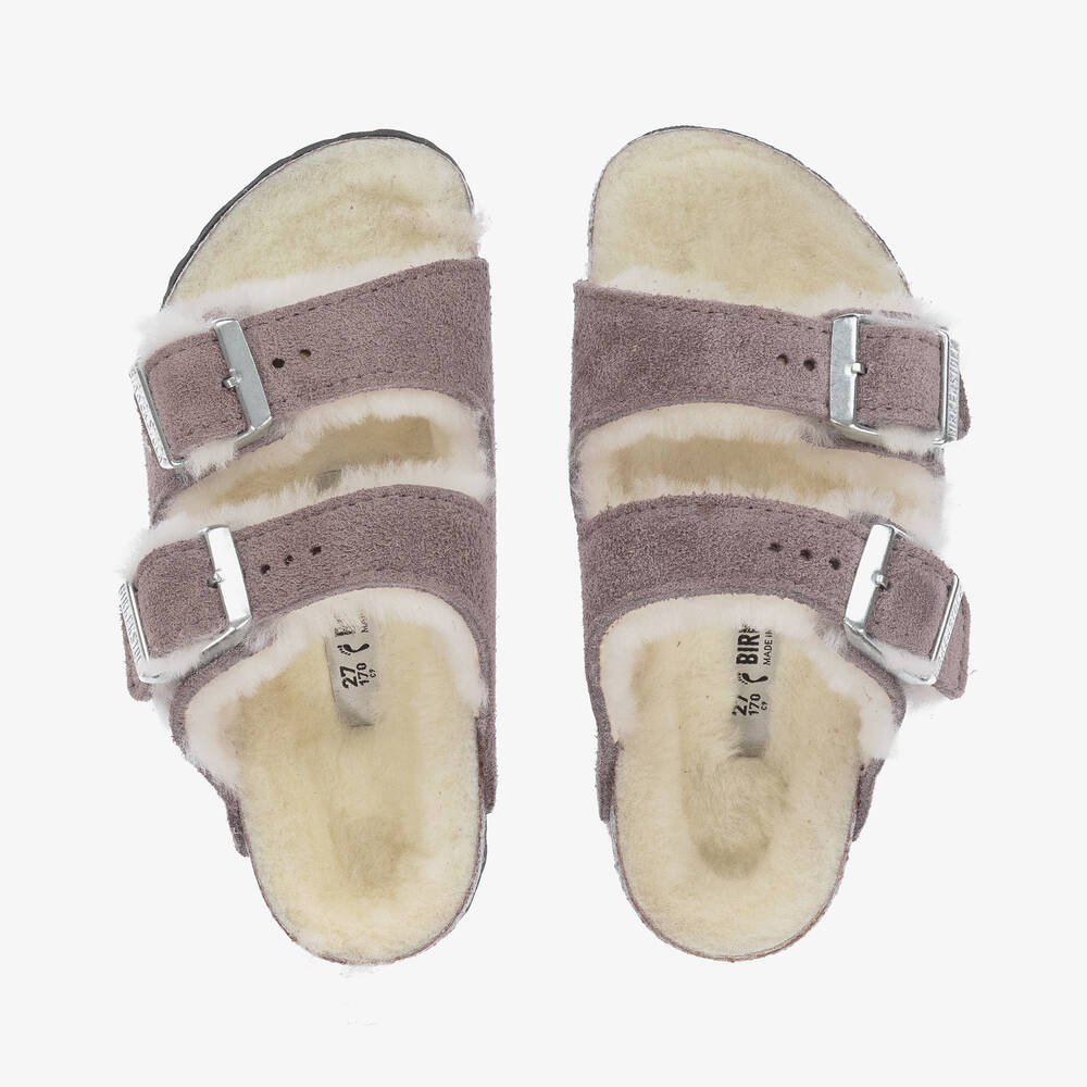 Lilac purple sandals for girls by Birkenstock, designed in the German brand's Arizona silhouette. These narrow-fit sandals are made in beautifully soft suede leather, with a fluffy, natural shearling wool lining and insole that is both cosy and breathable. The ergonomically designed natural cork midsole promotes good posture, whilst providing comfort and the non-slip rubberised outer sole ensures good grip. They have logo-embossed buckle fastening straps that can be adjusted for a secure fit, with further branding on the side for a distinctive finish.