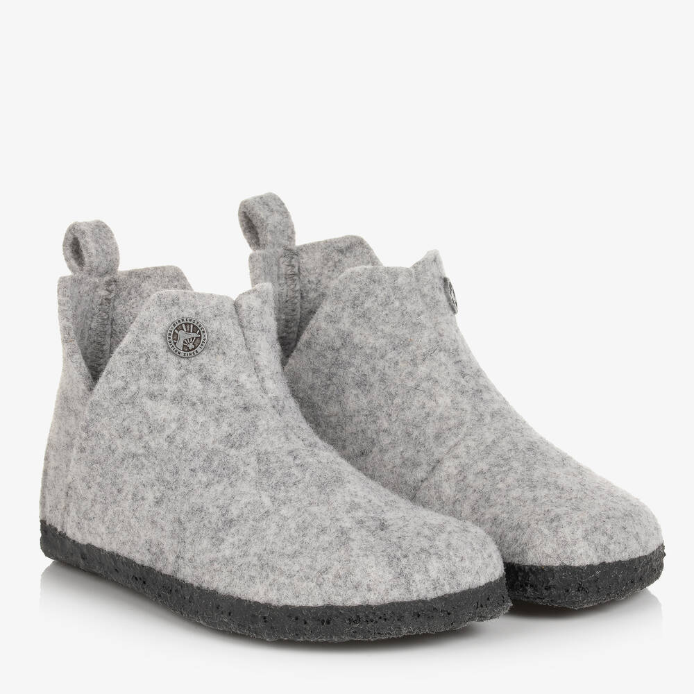 Grey marl felted wool slippers for boys and girls by Birkenstock, designed in an ankle height and a narrow fit. So cosy to slip on for everyday lounging, they have a removable natural cork footbed with a soft leather lining, anatomically contoured for optimum comfort. The outsole is coated in latex for improved grip. There is a subtle logo embroidered on the side and a logo rivet on the top.