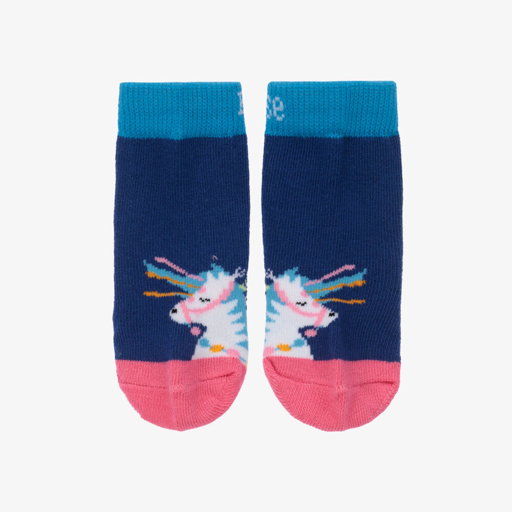 Blue cotton rich socks for girls by Blade & Rose, with a colourful Carnival Horse motif on the front. Soft and stretchy, they have bright blue and pink trims for contrast.