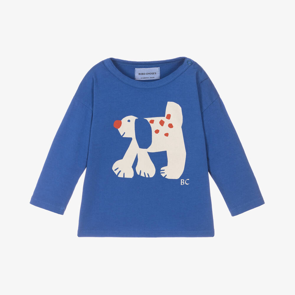 Mid-blue organic cotton top for baby boys and girls by Bobo Choses. The Spanish designer has styled this long-sleeved top with an abstract puppy dog and monogram logo print on the front. It is made in soft jersey and designed with a popper on the shoulder to make dressing simple.