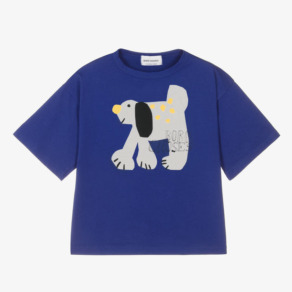 Royal blue T-shirt for boys and girls by Bobo Choses, super comfortable in soft organic cotton jersey. Cool and quirky, this design features an abstract puppy dog with monogram logo lettering on the front. The roomy fit and the dropped shoulders make this short-sleeved tee a great choice for laid-back styling.