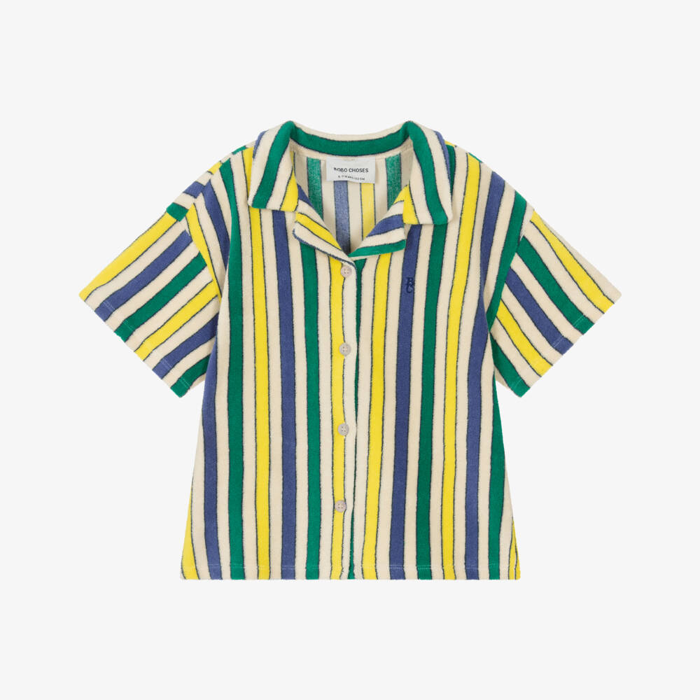 Boys ivory organic cotton shirt by Spanish brand Bobo Choses, designed in vivid stripes of blue, yellow and green. Soft to the touch, this casual shirt is made in towelling fabric with logo embroidery on the chest. It is styled with an open neckline and front button fastenings.