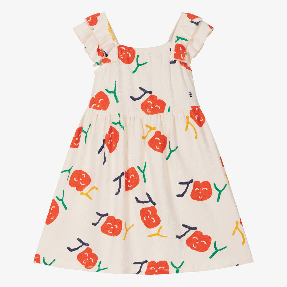 Ivory dress for girls by Bobo Choses, made in lightly textured organic cotton. Ideal for the warmer months, this lovely dress has frilly shoulder straps and a square neckline which pulls on easily over the head. The smiling joy print is designed in a red, green and yellow colour palette for a playful feel.