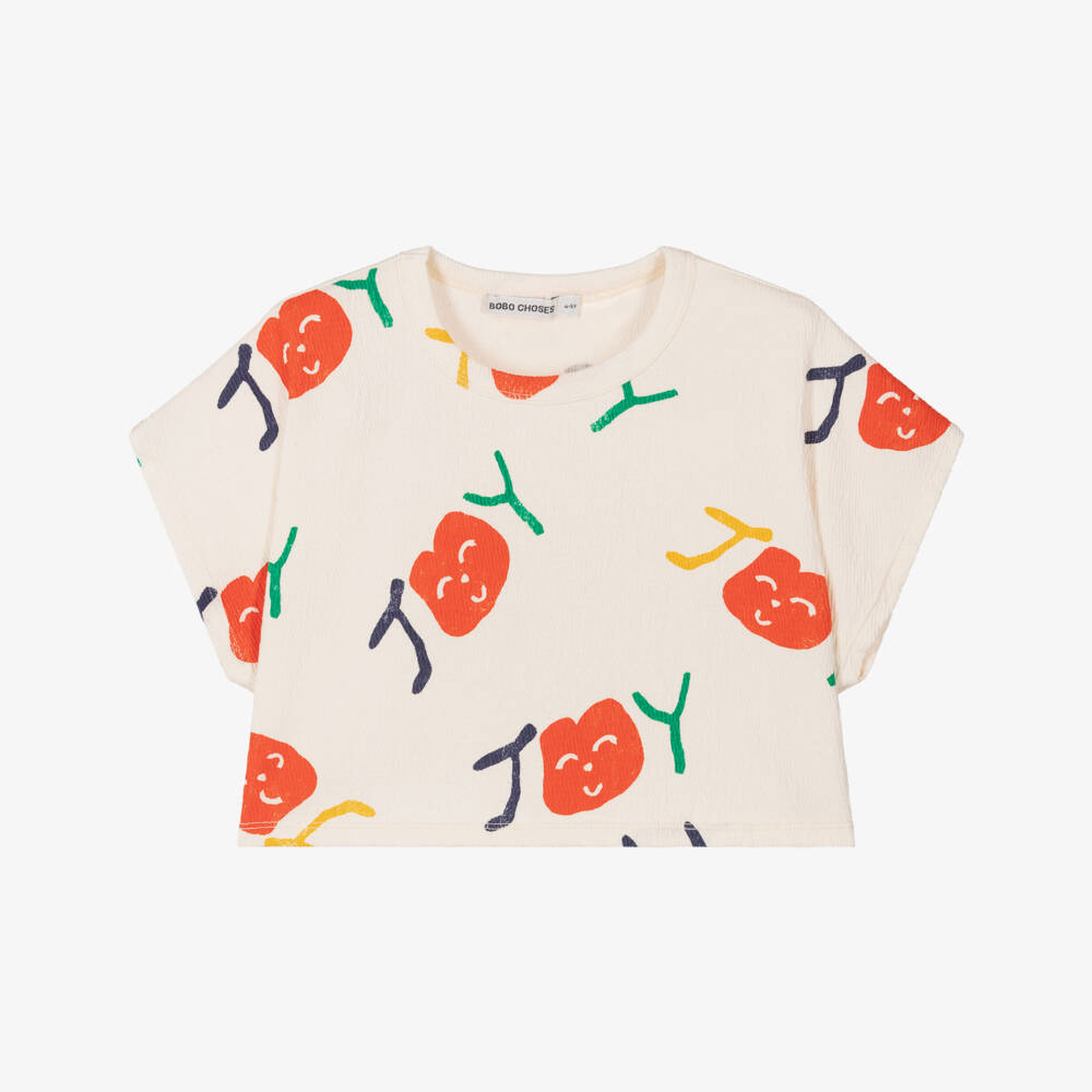 Ivory top for girls by Bobo Choses, made in lightly textured organic cotton for a gentle feel. This casual top has a comfortable round neck and a boxy fit. The smiling joy print is designed in a fun red, green and yellow colour palette.