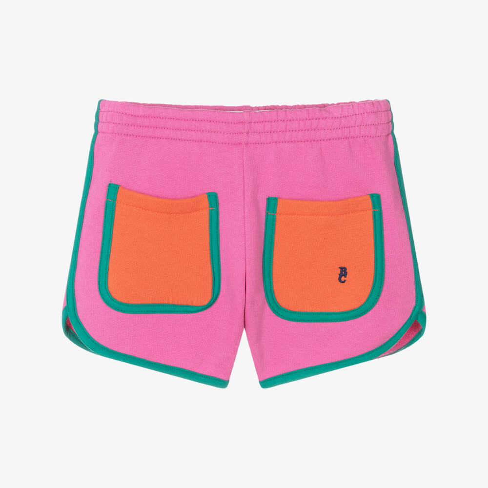 Fuchsia pink, organic cotton shorts for girls by Bobo Choses, made in comfortable, mid-weight jersey. Adding a vibrant look to her casual wardrobe, they have contrasting dark green trim and orange patch pockets. The waistband is elasticated for easy pull-on.