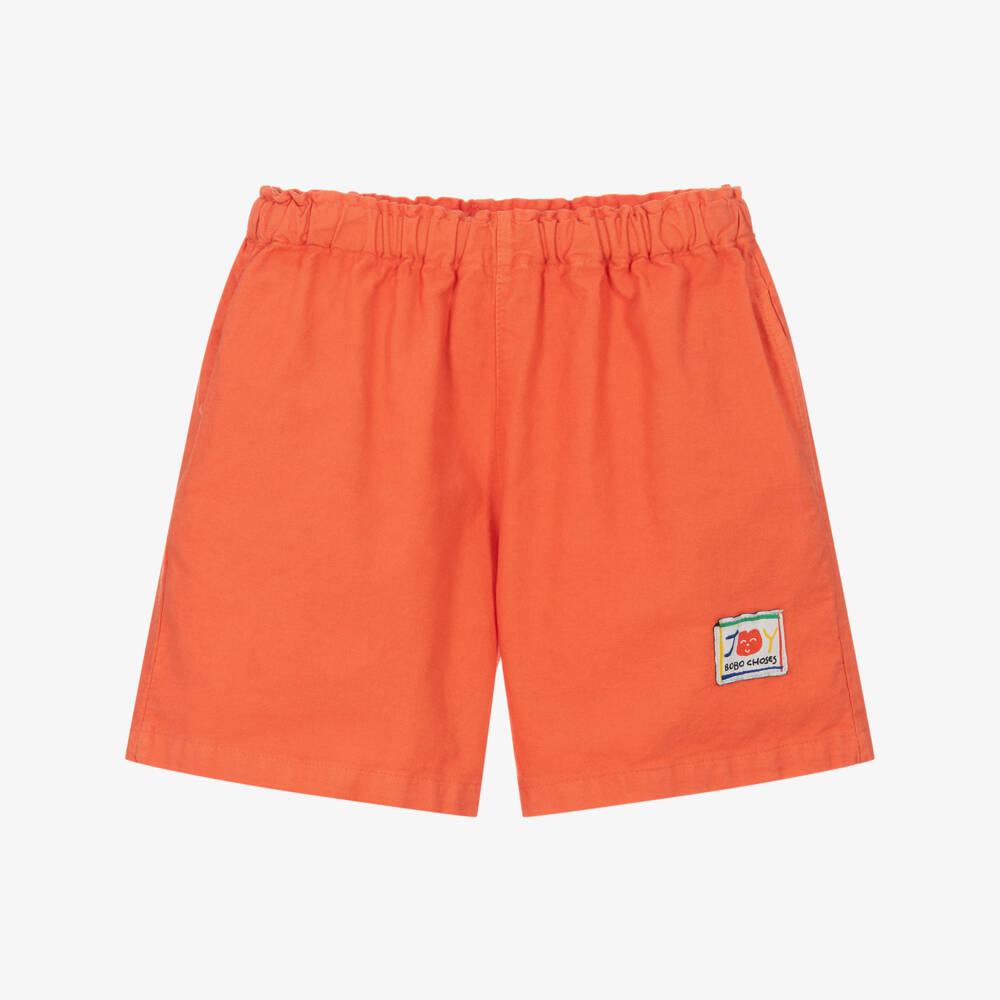 Vivid orange shorts for boys and girls by Bobo Choses, made in organic cotton with recycled fibres. They are simply styled with neat side pockets and an inner drawstring waist. There is a small logo patch on one leg with Joy collection branding.