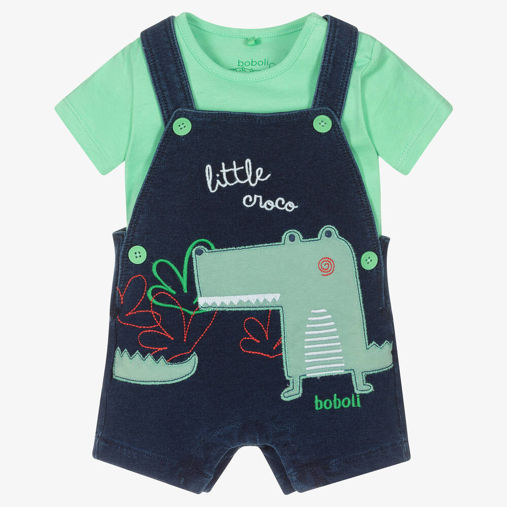 Blue dungarees set for baby boys by Boboli, made in soft cotton jersey. Made to look like denim, the dungaree shortie has a sweet bib front with a crocodile motif and 'little croco' embroidered on the chest in white. There are bright green buttons on the shoulder straps and on the side of the body, along with popper fastenings between the legs for easy dressing. A versatile piece, it can be worn alone on warmer days or layered with the plain green T-shirt as part of the set.