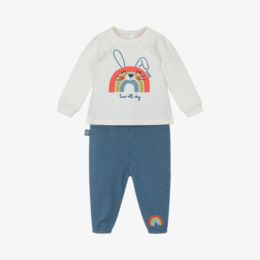 A sweet trouser set for baby girls by Spanish brand Boboli. Made in soft cotton jersey, this set consists of an ivory sweatshirt with pretty ruffle detailing and a rainbow bunny on the front, and pinstripe blue trousers with a rainbow logo on one leg for a coordinating look. The sweatshirt has popper fastenings on the back for fuss-free dressing.