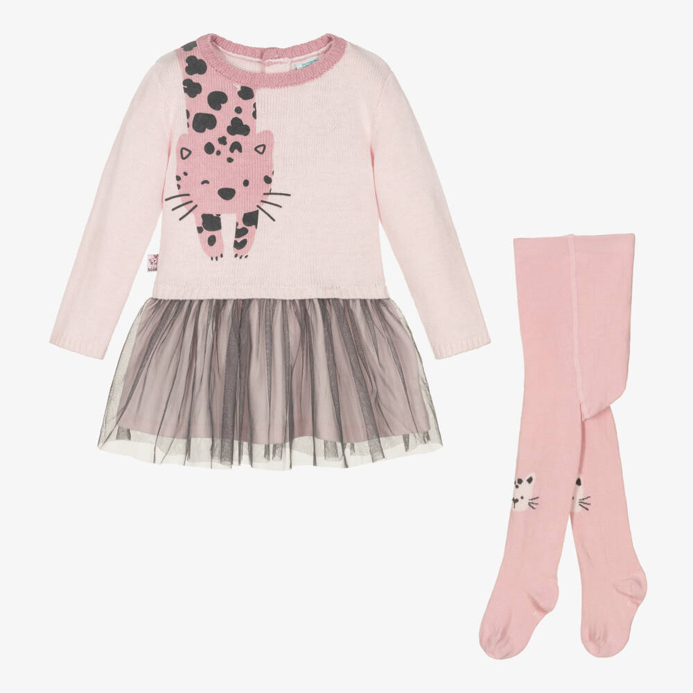 An adorable pale pink dress set for baby girls by Boboli, made from a soft, cosy knit. The dress has a cute, over-the-shoulder leopard design and a grey tulle skirt lined in soft cotton jersey. It comes with matching pink cotton tights and has a back button fastening for a classic finish.