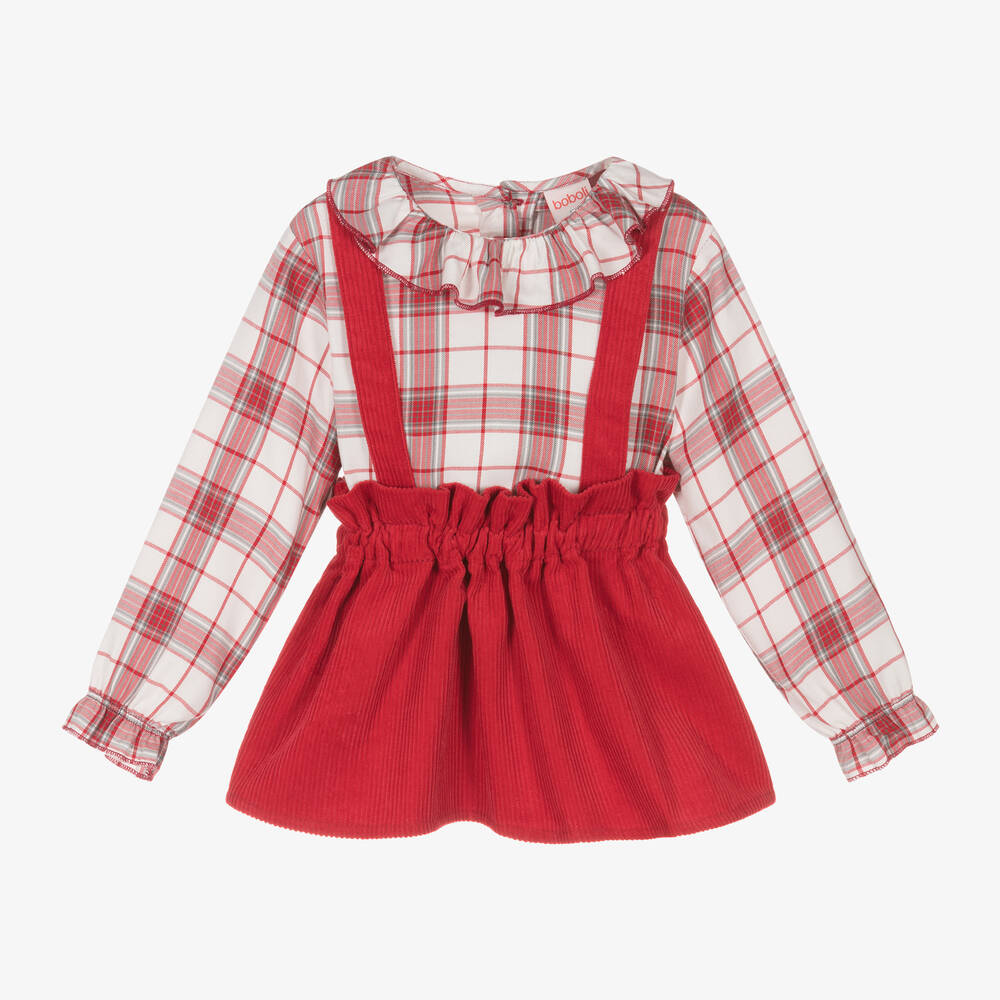 Traditional red skirt set for baby girls by Spanish brand Boboli. The red and white tartan blouse is made in super soft, comfortable viscose, with a ruffle collar and gently elasticated, frilled cuffs. The cotton corduroy skirt has a frilly, elasticated waistband and adjustable shoulder straps for a great fit. Grey marl, cotton-blend tights complete the set, with grey shoes printed on the feet and little red velvet bows on the ankles.