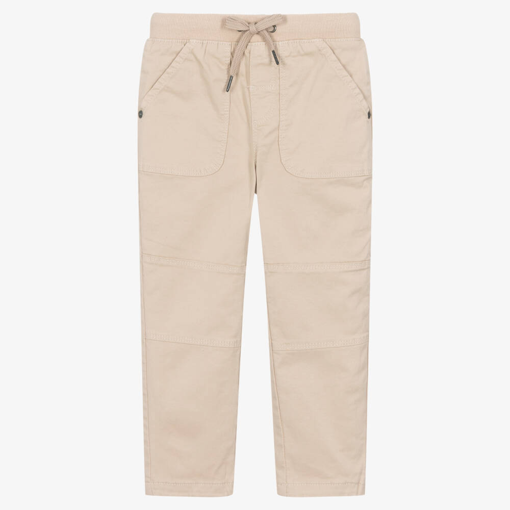 Casual beige trousers for boys by Boboli, made in soft cotton twill with a slight stretch for comfort. This pull-on style is designed with a drawstring tie on the elasticated waistband and a full cotton jersey lining for added warmth. There are two patch pockets on the front, knee patch detailing and a little tonal logo patch on the back.