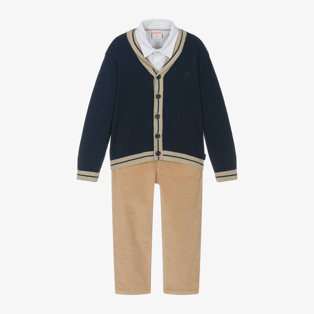 In a timeless styling, this navy blue and beige cotton trouser set for boys is by Boboli. Finely knitted with a touch of wool, the collared cardigan buttons up on the front and has elbow patch detailing. The corduroy trousers are styled with matching navy blue trims and four pockets. With slight stretch on the fabric and an adjustable waistband for a comfortable fit, they fasten with a front zip and button. An off-white Oxford cotton shirt completes the smart-casual look.