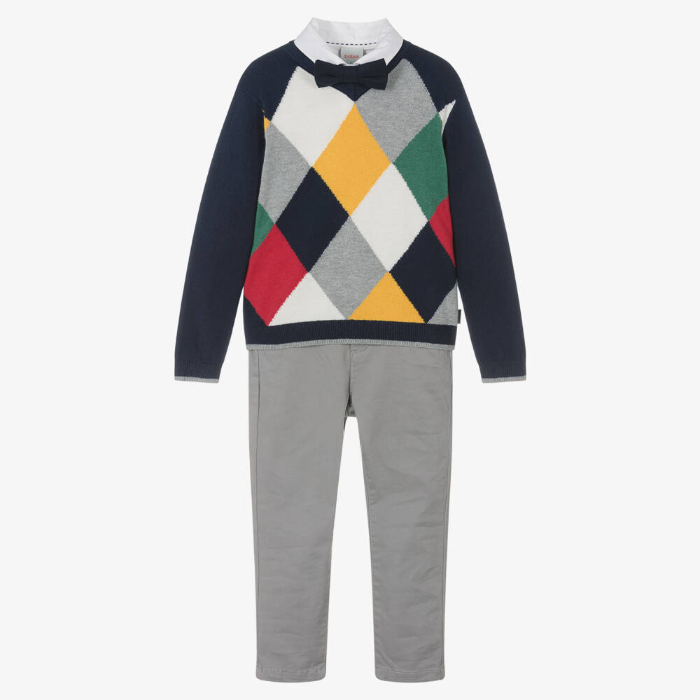 Navy blue and grey trouser set for little boys by Spanish brand Boboli, lovely for any special occasion. The classically styled white cotton poplin shirt fastens with concealed buttons and can be worn with the adjustable navy blue bow tie for a smarter look. The grey trousers are made in a soft twill, have pockets on both the front and back and fasten with a button and zip. An adjustable waist ensures a comfortable fit. A navy blue sweater with a colourful argyle pattern in yellow, green and red, completes this charming set.