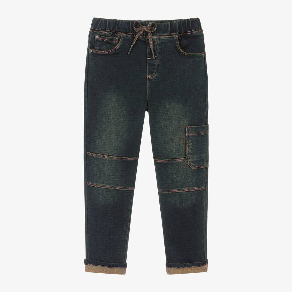 In a cool jogger style, these casual Boboli jeans for boys have faded patches and contrasting pink stitching. Easy to wear, they simply pull on and have a drawstring waist for an adjustable fit. There are two hip pockets, a coin pocket and a patch pocket on one leg. Branded metal rivets and a logo patch on the back add a subtle designer touch.