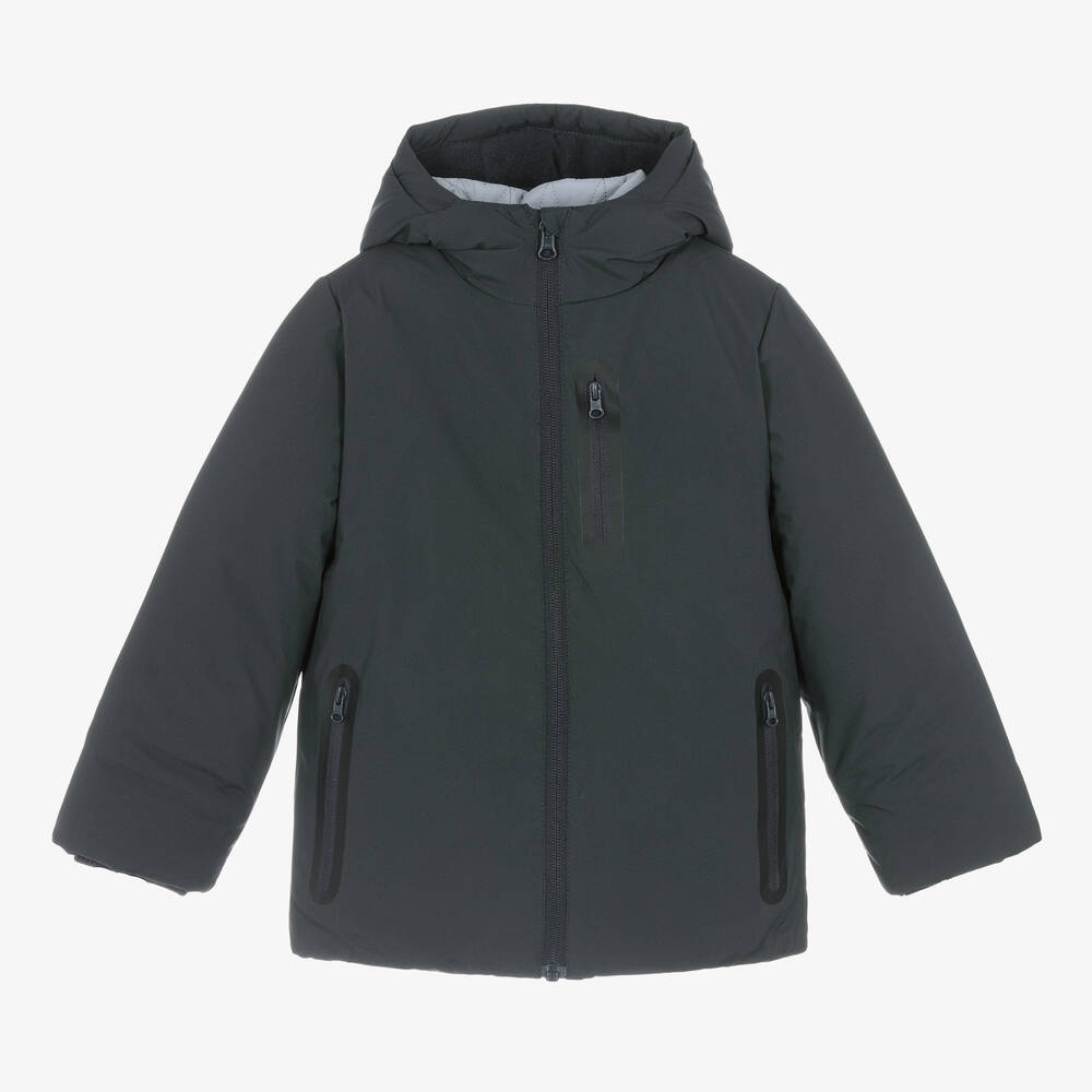 Dark grey 2-in-1 coat for boys by Spanish brand Boboli, made in a smooth, matte fabric with a soft polar fleece lining. Warmly padded, this practical hooded design fastens with a zip on the front. It has internal ribbed cuffs and three useful zip-up pockets. It comes with a detachable, light grey quilted gilet that can be zipped inside on colder days.