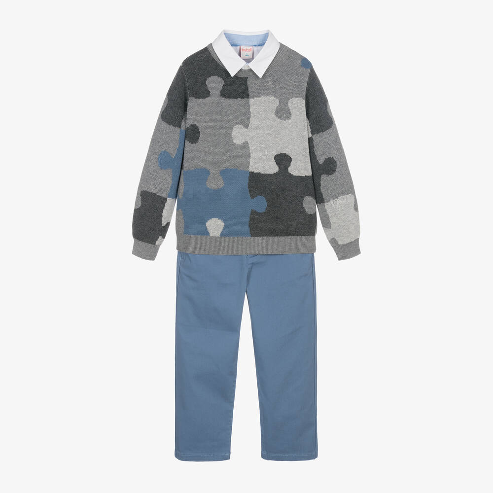 A charming grey and blue cotton trouser set for boys by Spanish brand Boboli. The fun puzzle design sweater is knitted in a soft viscose blend with a touch of wool for extra warmth. Featuring five useful pockets and an adjustable waistband, the chino-style twill trousers fasten with a front zip and button. A classic off-white Oxford cotton shirt in slim fit complements the set with coordinating accent buttons for a complete, smart-casual look.