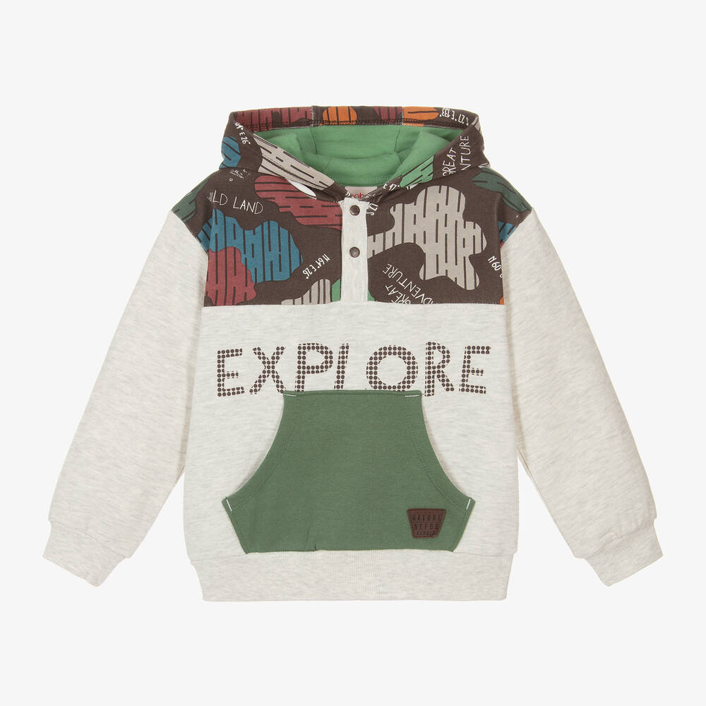 Grey marl cotton hoodie for boys by Spanish brand Boboli, with 'Explore' printed across the front in brown, rubberised dots. On the hood and around the shoulders is a map print with adventurous slogans in brown, red and blue. Made in soft, comfortable jersey with a warm, fleecy inside, the hoodie has ribbed trims for extra cosiness. There are branded popper fastenings on the half-placket and a logo badge on the useful, green pouch pocket.