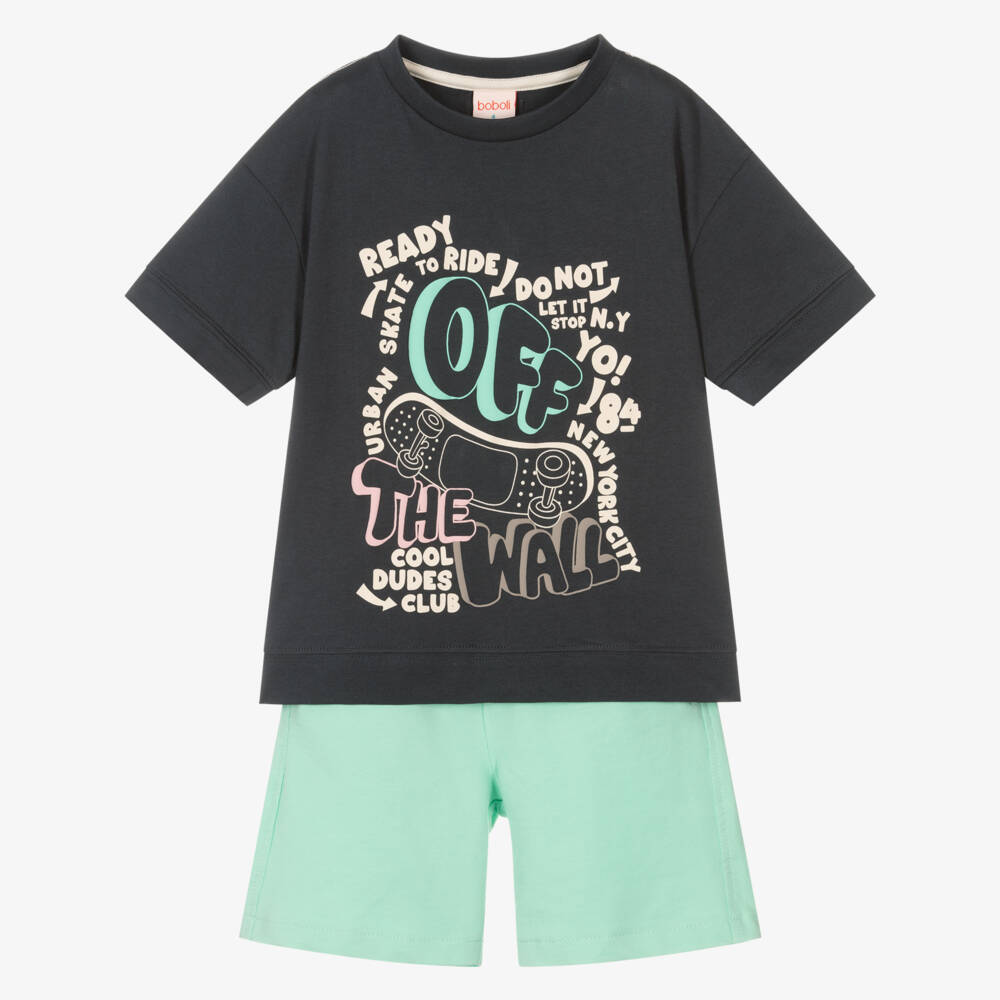 In dark slate grey and aqua green, this casual shorts set for boys is designed by Boboli. Made in soft cotton jersey, the crew neck T-shirt is printed with cool skateboard-themed slogans in beige and green. The outfit is completed with a pair of comfortable shorts, with a drawstring waistband and zipped side pockets.