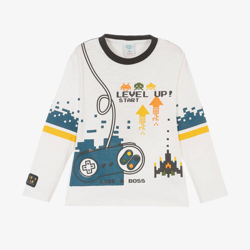 Ivory cotton top for boys by Boboli, made in comfortable slubbed jersey. It is printed with a colourful pixelated gaming design on the back and front, with a rubberised logo badge on one sleeve.