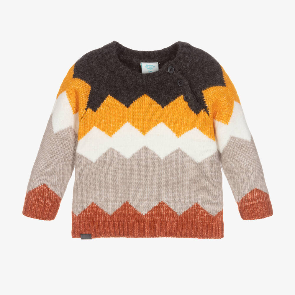 In a beige, orange and brown zigzag pattern, this lovely sweater for boys is by Spanish brand Boboli. Cosy and comfortable, it is knitted in a soft acrylic blend, with button fastenings on the raglan sleeve for easy dressing.