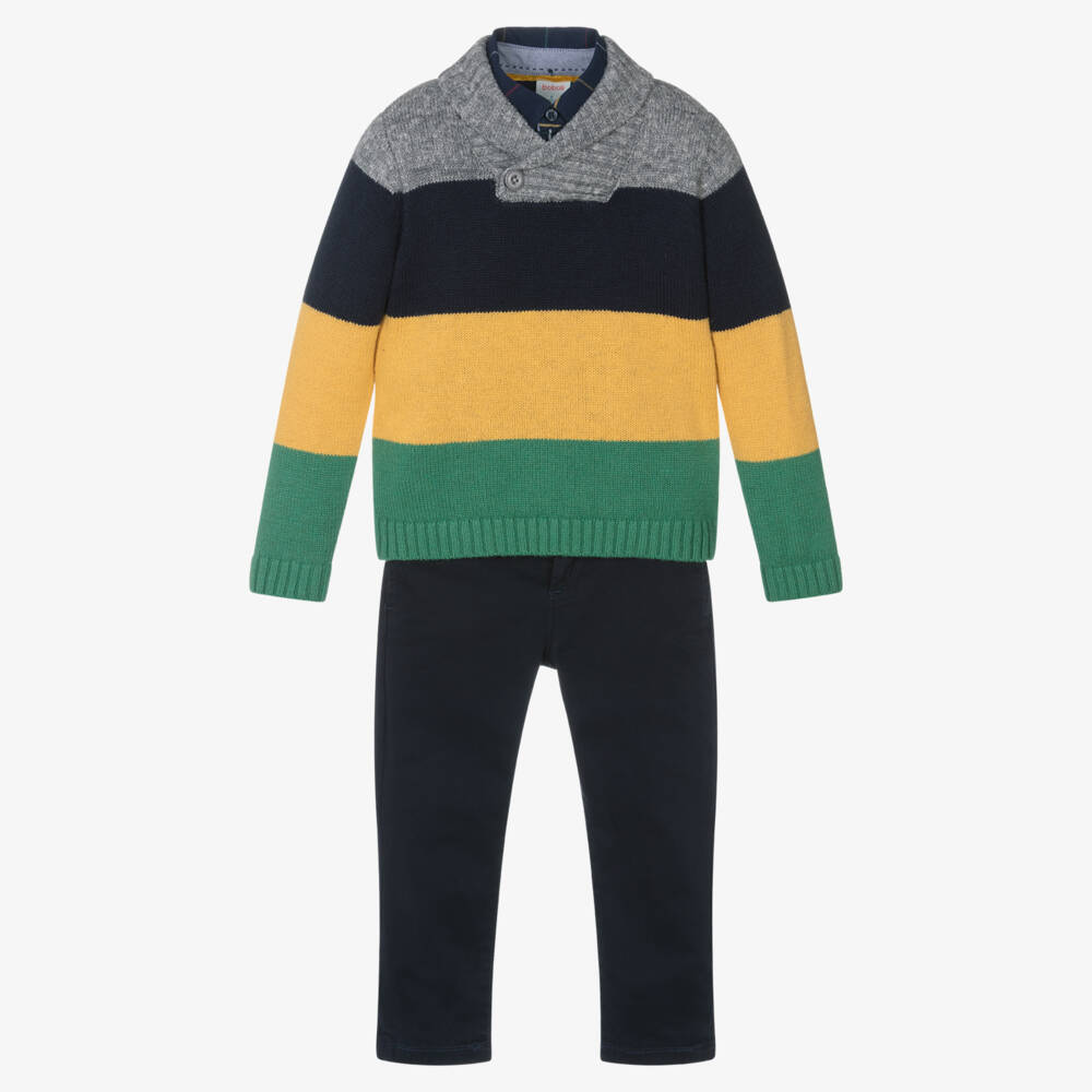 A smart-casual three piece trouser set for boys by Spanish brand Boboli. In green, yellow, navy blue and grey, the colourblock sweater is knitted in a soft cotton blend, with a stylish shawl collar. The navy blue poplin shirt has a multicolour check pattern, with button fastenings on the front and cuffs. The navy blue cotton trousers have front and back pockets, a comfortable adjustable waist, and a button and zip fastening.