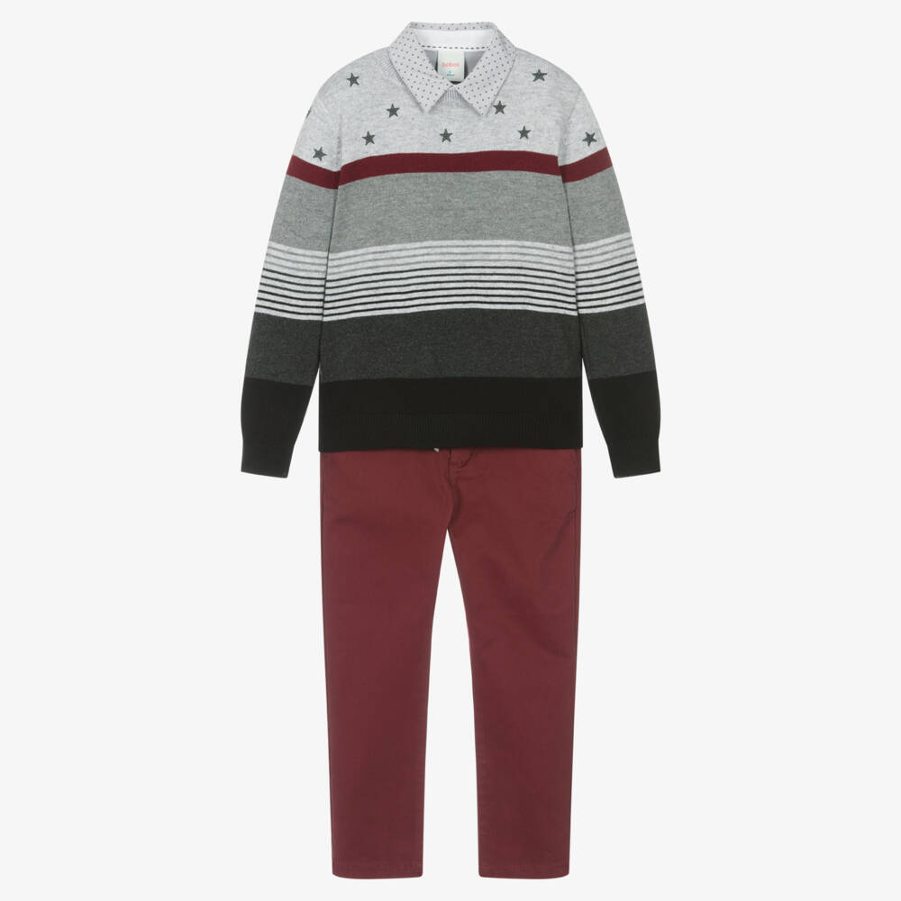 A smart-casual grey and burgundy red trouser set for boys by Spanish brand Boboli. In a soft cotton weave the classic grey shirt is patterned with small stars, has grey elbow patches and grey overstitch detailing. The burgundy red trousers have a soft brushed feel, pockets on both the front and back and a button and zip fastening, with an adjustable waist for a comfortable fit. A lightweight knit sweater gives a coordinated finish, striped in grey and burgundy red, it has embroidered stars across the shoulders.