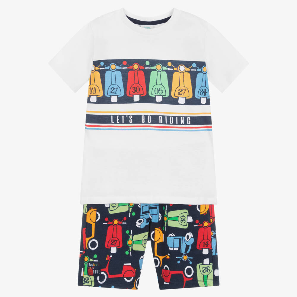 White and navy blue shorts set for boys by Boboli, made in soft and comfy cotton jersey. Featuring a colourful scooter theme, the T-shirt has a fun design across the front, with a slogan print below. Patterned in a matching print, the shorts have a ribbed drawstring waist for an adjustable fit, with branded rivets on the two front pockets.