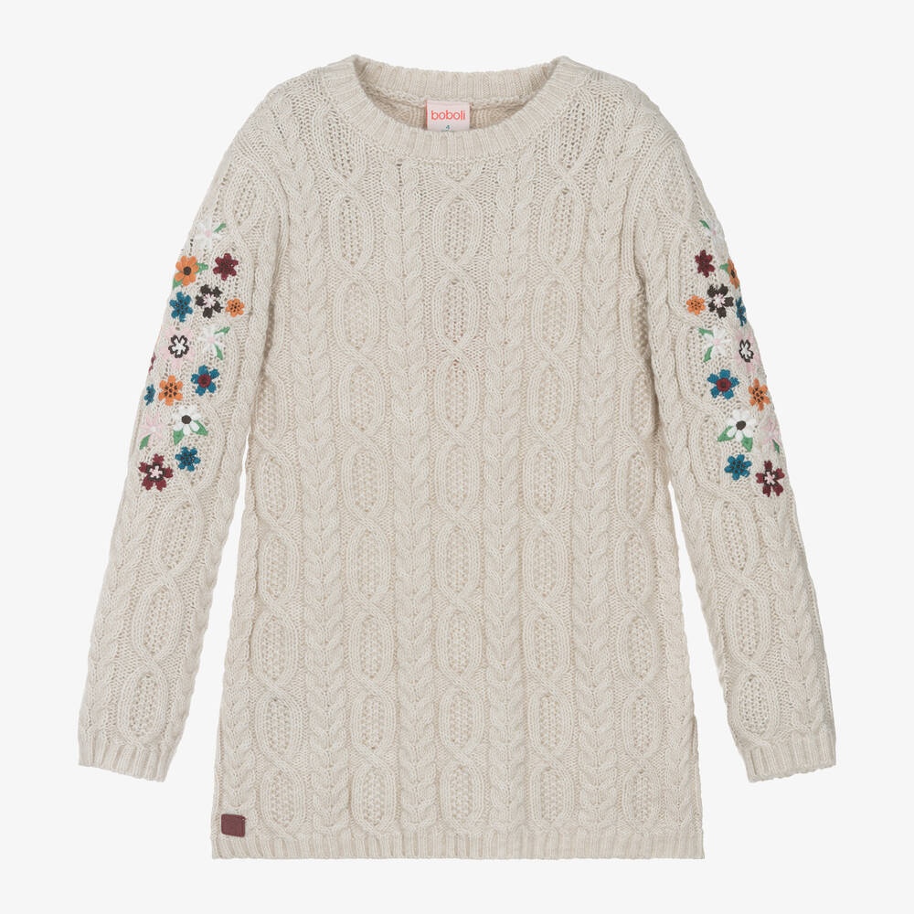 Gorgeous beige cable knit sweater dress for girls by Spanish brand Boboli, with beautiful, colourful, floral embroidery on the sleeves. In a soft, mid-weight knit, it has neat, ribbed trims and is endlessly comfortable. A burgundy red logo patch is sewn by the hemline.