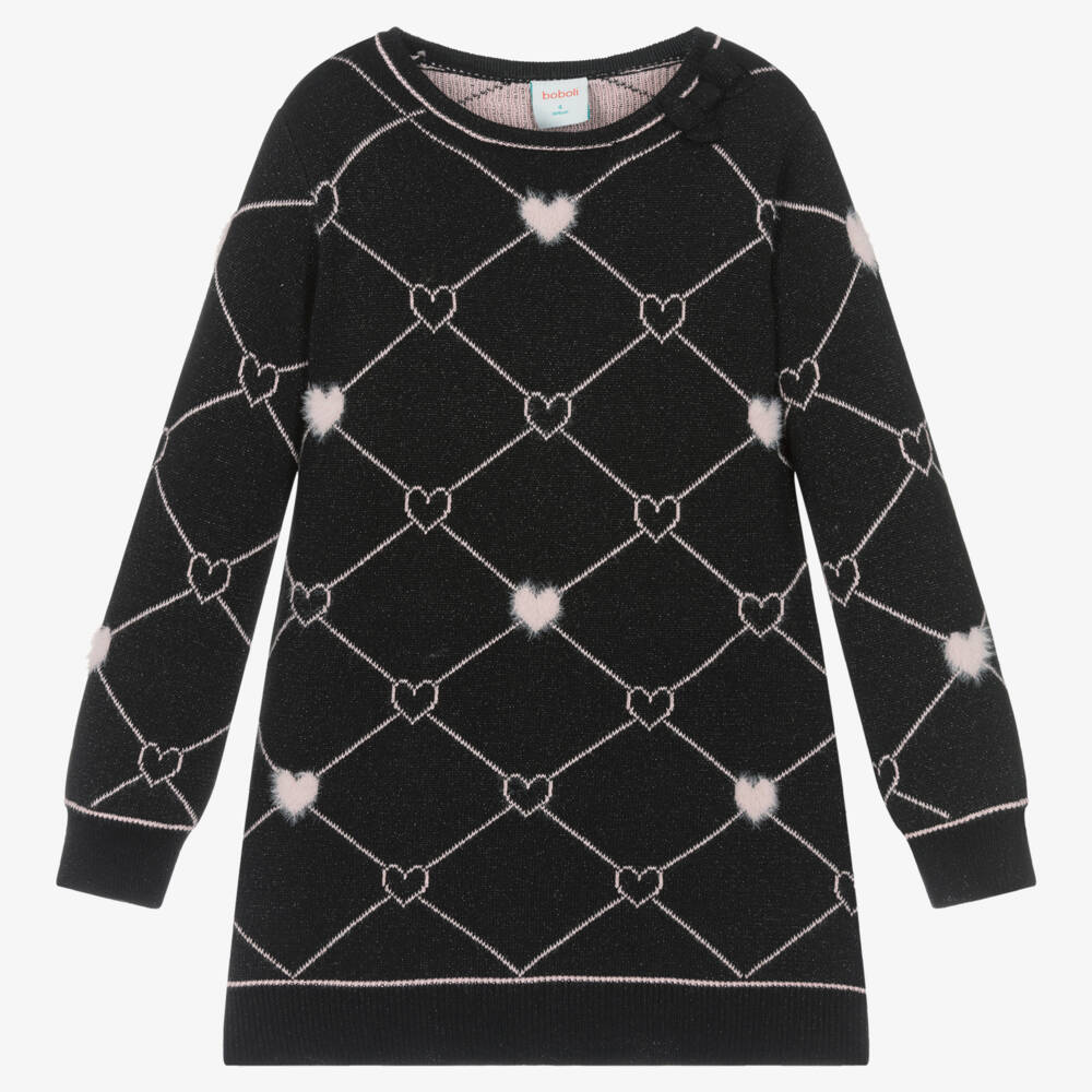 Black sweater dress for girls by Boboli, knitted in a soft cotton blend with a glittery lurex weave. Mid-weight and comfortable to wear, this knee-length dress has a pink diamond-shaped pattern that incorporates fluffy pink hearts within the design. There is a cute bow on one shoulder and lightly ribbed edges on the cuffs and hem.