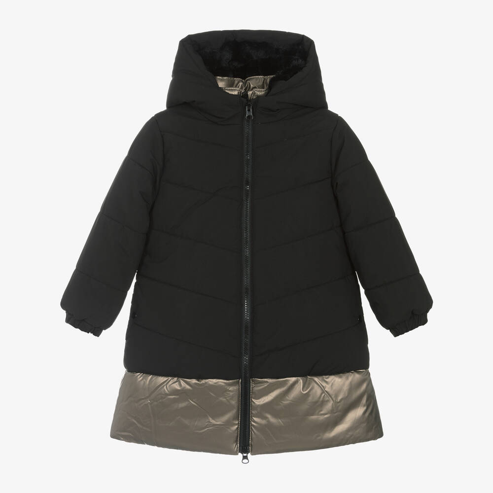 A black and metallic gold puffer coat for girls by Boboli, made in soft matte fabric with silky smooth trims. This long coat, ideal for school, has a double zip design to look like an integrated jacket. To withstand the cold, the main body and the hood both have a super soft faux fur lining. It has elasticated cuffs and fleece-lined pockets for extra comfort.
