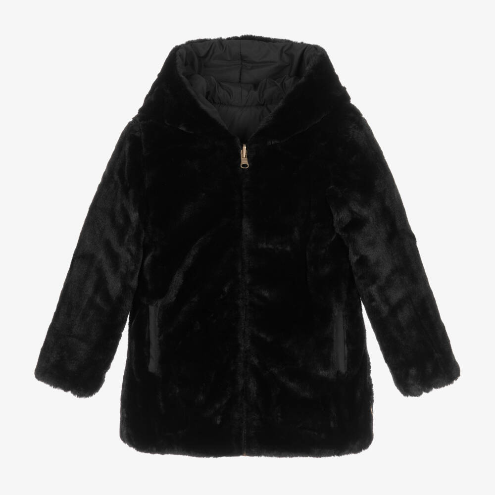 Girls reversible, black hooded puffer coat by Boboli. Warmly padded, this cosy coat is soft and smooth on one side, while the reverse is made in a beautifully soft plush. Fastening on the front with a zip, both sides have useful pockets and a logo tab for a discreet designer finish.