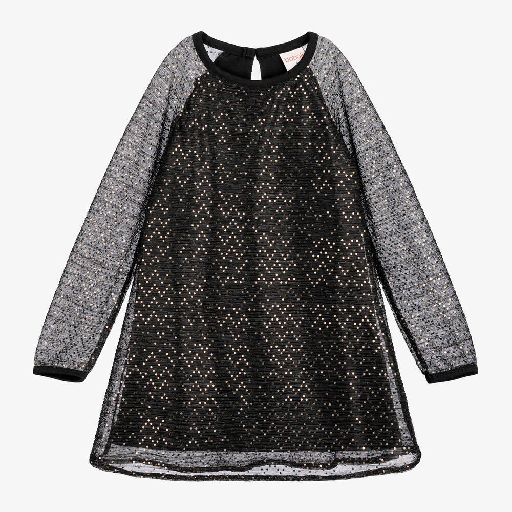 Sheer black tulle party dress for girls by Spanish brand Boboli, shimmering with gold sequins. It has a stand-out look, catching the light beautifully, and an elegant, A-line silhouette. Lined in soft, stretchy jersey for comfort, it has a keyhole button fastening around the back.