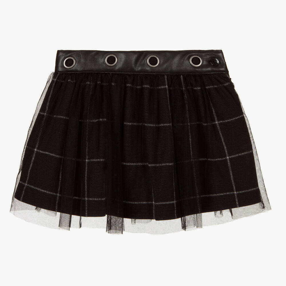 Black tartan jersey skirt for girls by Boboli, with a sheer black tulle overlay. The faux leather waistband is detailed with silver metal eyelets. It has a useful adjustable waist and fastens with a button and zip on the side.