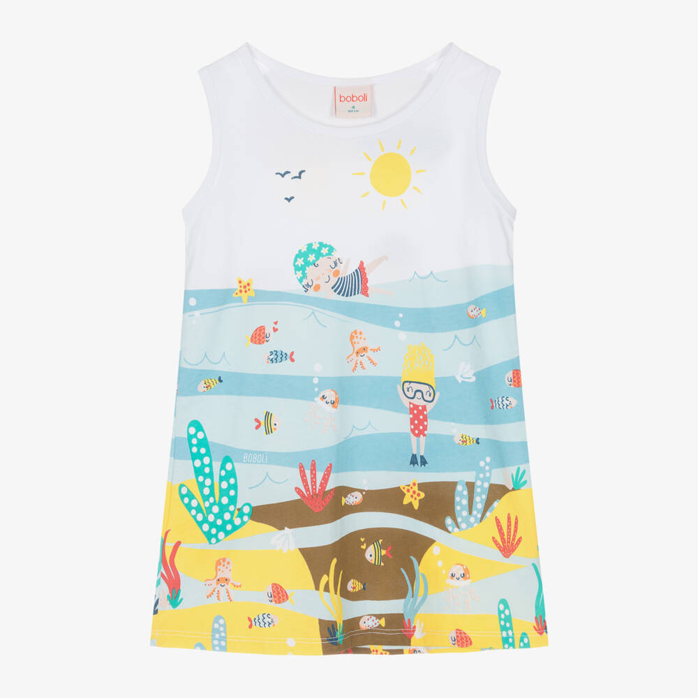 Adorable light blue beach dress set for younger girls by Boboli, patterned with playful sealife and swimming scenes. Ideal to wear as a pool and beach cover-up, the sleeveless dress is made in soft cotton jersey. The matching bikini bottoms have cute red star appliqued on the sides and a rubberised logo on the back. Silky smooth and stretchy, they contains Lycra Xtra Life fiber for long lasting shape and fit, and better resistance against pool water.