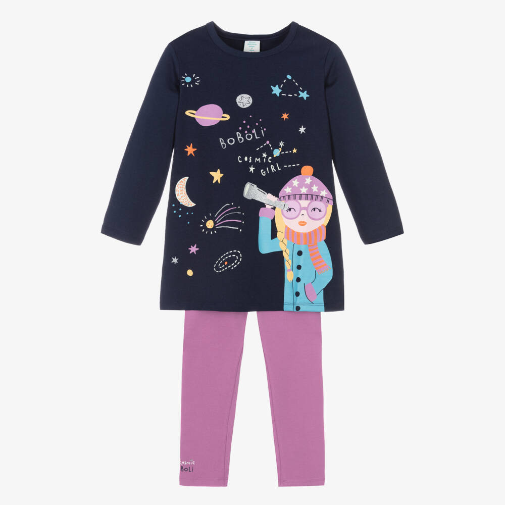 Cotton dress and leggings set for girls from Spanish label Boboli, in navy blue and purple-pink. Lovely for any outer-space enthusiast, the long-sleeved dress has stars, planets and a little girl printed on the front, with glitter accents and fun glow-in-the-dark details. With a matching 'Cosmic' print on the ankle, the full-length leggings have an elasticated waist to help make dressing simple. Both pieces are made in soft, stretchy and lightweight jersey for comfortable wear.