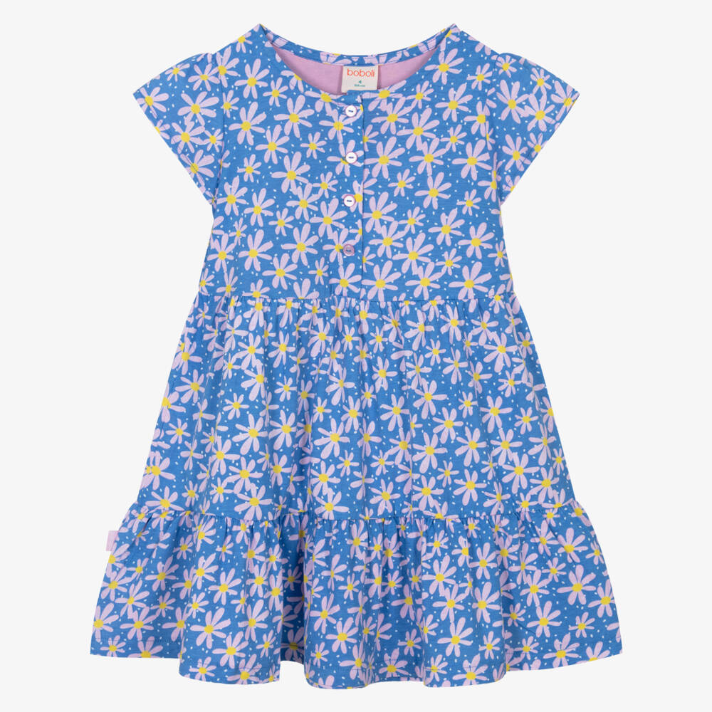 A charming blue cotton dress for girls by Boboli, with a pink flower print. Made in soft cotton jersey. this comfortable dress has button fastenings on the front and a flattering A-line shape.