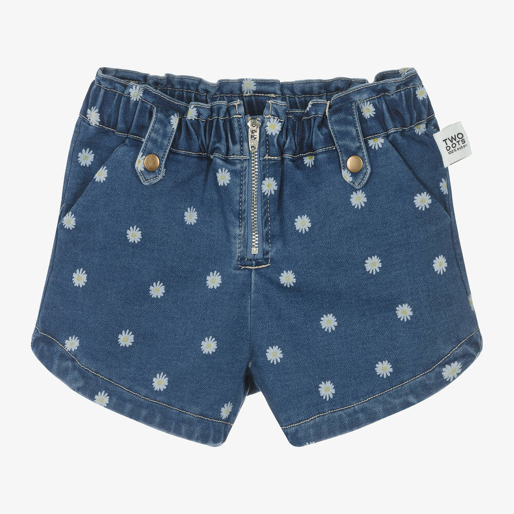 Blue cotton blend denim shorts for girls by Spanish brand Boboli, with a pretty daisy design. Casual and comfortable, they have pockets on both the front and back and a stretchy elasticated waistband. They fasten on the front with a zip and have popper fastening belt loops for a quirky finishing touch.