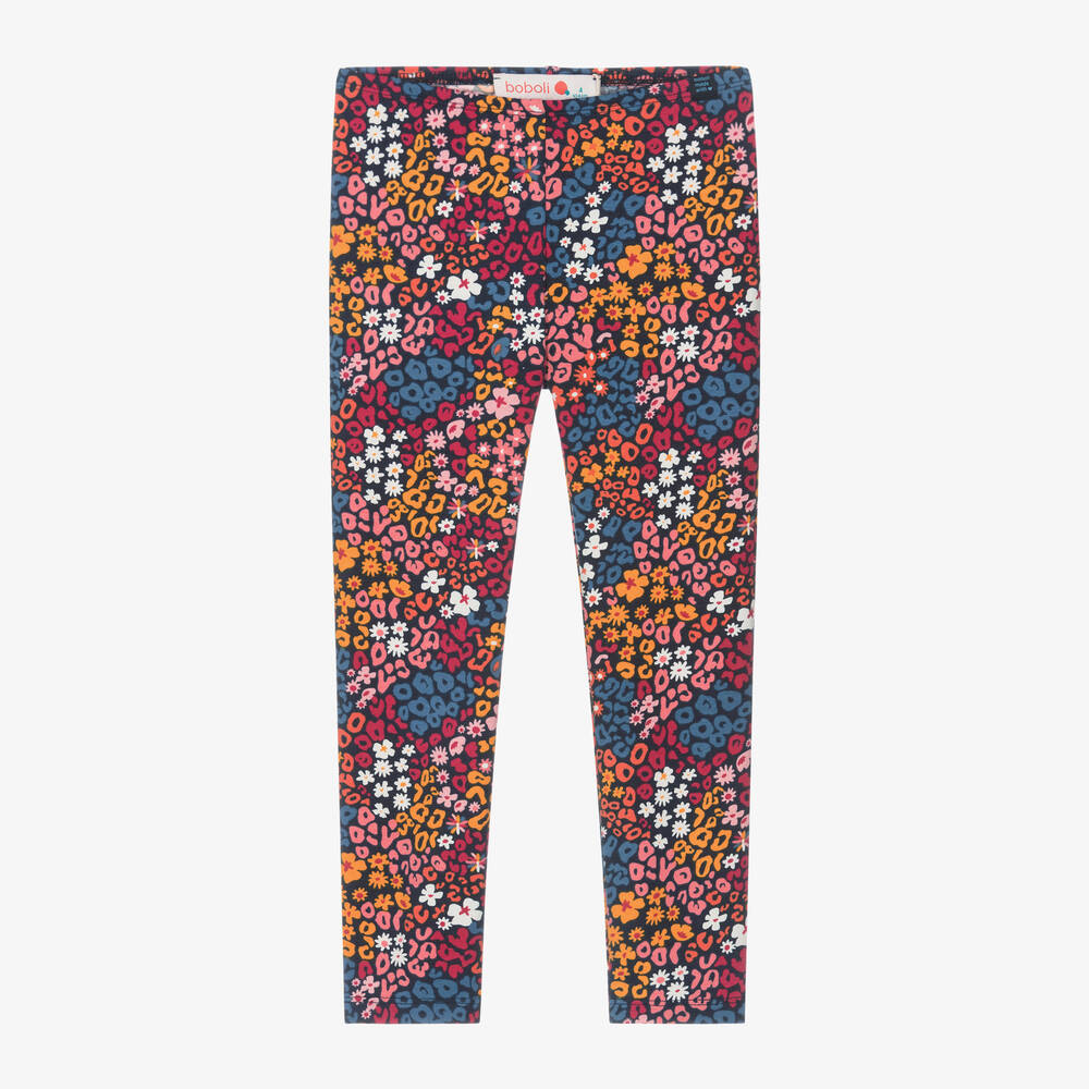 Navy blue with a fun and colourful floral print, these full length leggings for girls are by Spanish brand Boboli. Easy and comfortable to wear, they are made in soft cotton jersey and have a gently elasticated waist.