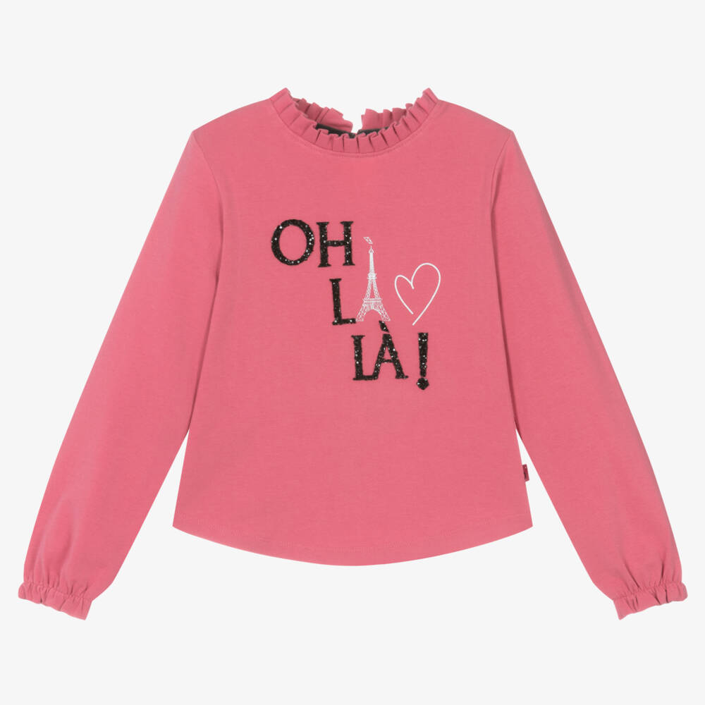 Stylish coral pink long-sleeved top for girls by Boboli, made in a soft and stretchy cotton jersey. This comfortable top has a frilled neckline and elasticated frilled cuffs, with a single-button fastening on the back. It has a Parisian-inspired motif on the front crafted from black crystal beads, for a lovely sparkling finish.