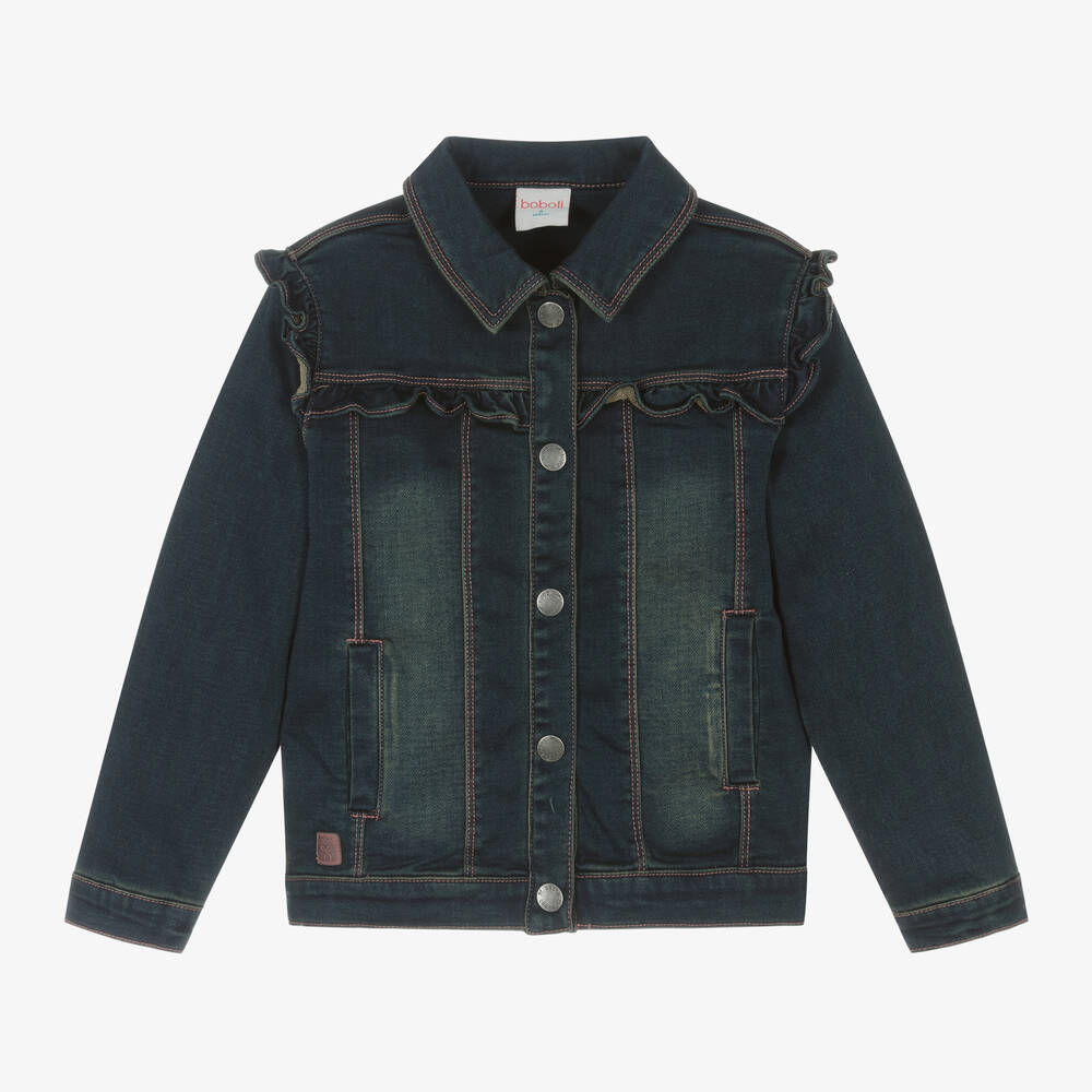 A dark blue denim jacket for younger girls by Boboli, with cool faded patches and contrasting pink stitching. A casual wardrobe essential, it is made in soft and stretchy denim with pretty ruffle trim and front pockets. The front and cuffs fasten with silver-tone branded poppers and there is a distressed pink, faux leather logo patch above the hem.